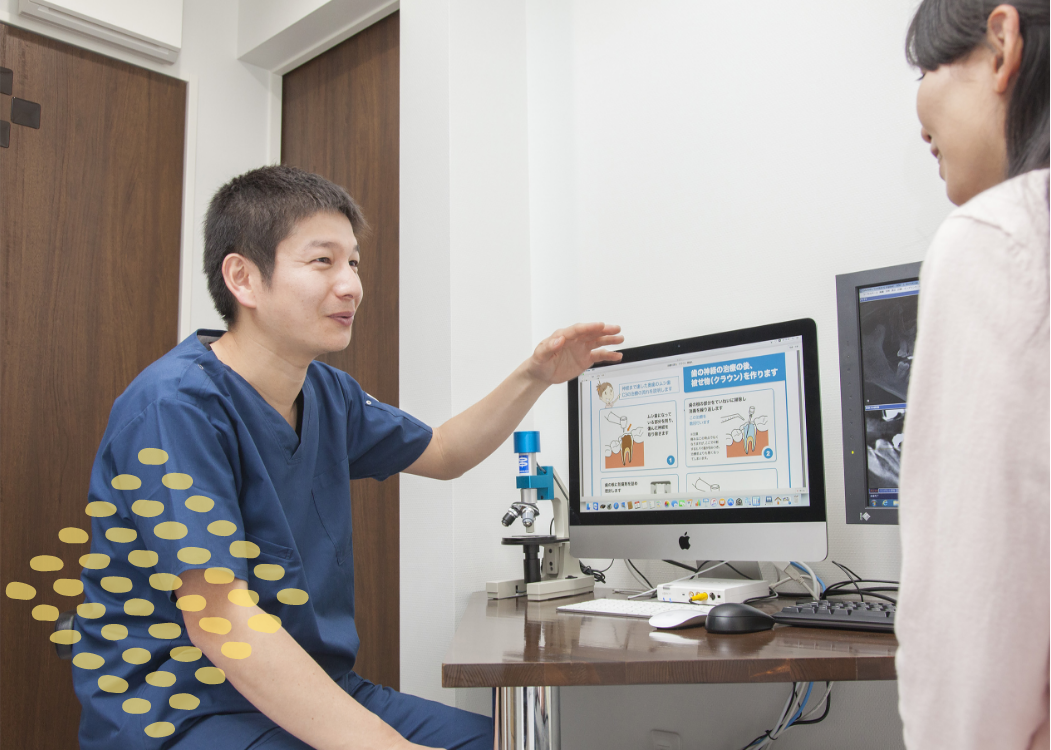 アニメーションを用いて分かりやすくご説明しますお口の状況や治療方法を分かりやすくお伝えするために、カウンセリング用パソコンソフトを使っています。検査結果やお口の状態を記録し、その情報をイラスト付きの資料にすることも可能です。目に見えるかたちで説明を行い、直感的に状況をご理解いただけるように工夫をこらしています。
