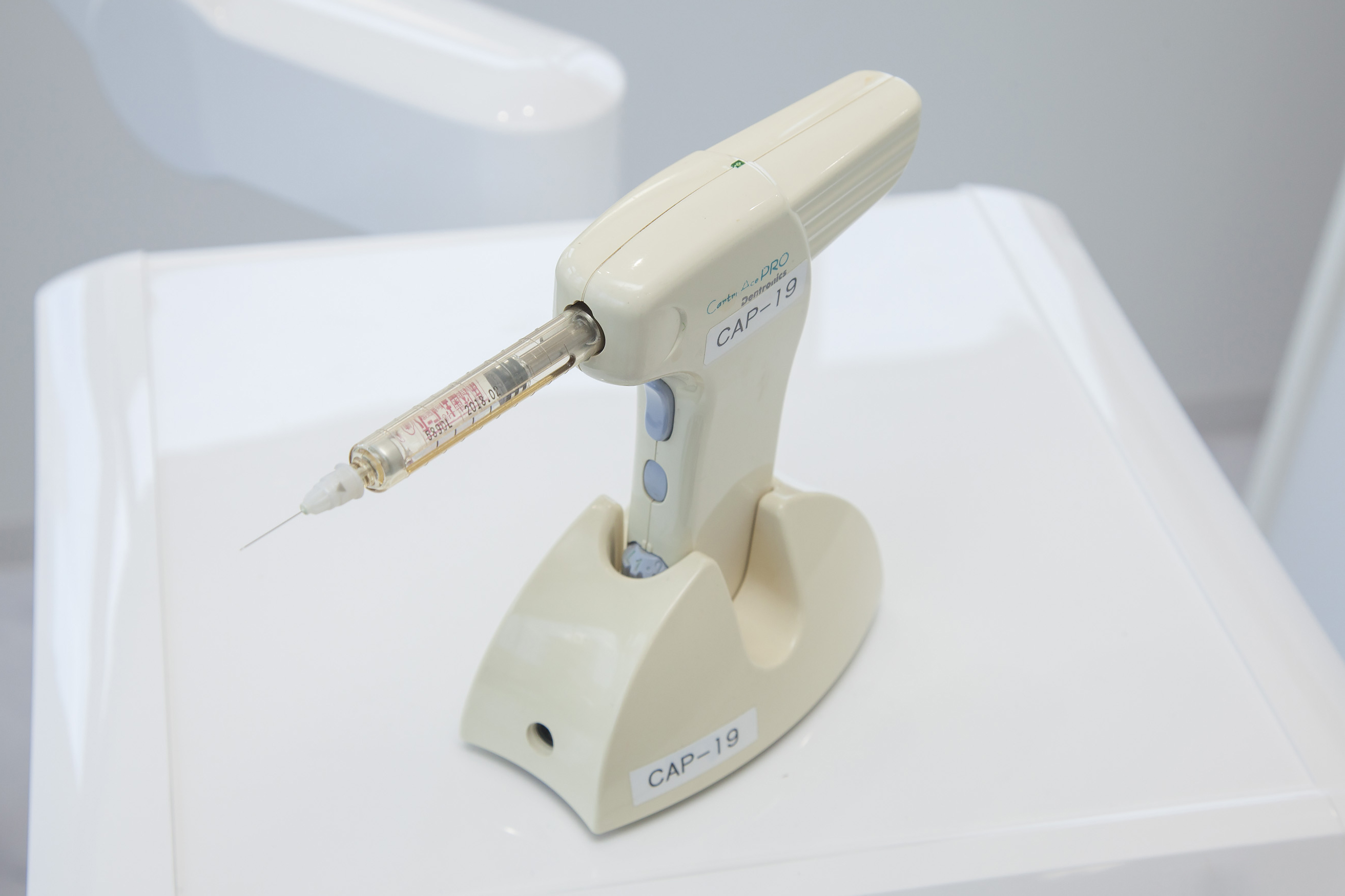 コミュニケーションを取りながら治療を行います当院は、できる限り痛みを抑えた治療のご提供を心がけています。例えば、注射の前には歯茎に表面麻酔を塗布し、電動麻酔器で一定のスピードを保ちながら薬液を注入することで、麻酔自体の刺激を軽減させています。さらに麻酔液は人肌程度に温めておくことで、少しでも不快感を減らせるようにしました。